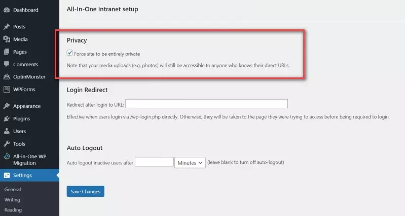 With one simple checkbox, you can make your entire site private to anyone not logged in. You can set any page or URL as the first page visited after logging in. Easily set a time interval for inactivity, after which users will automatically log out, protecting your sensitive company information. Intervals are set by minutes, hours, or days. Multisite support in premium version.
